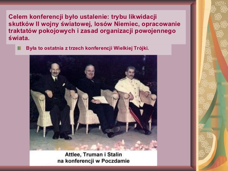 To był najdłuższy czas (od 17 lipca do 2 sierpnia). Szybka, łatwa i lokalna sprzedaż rzeczy z drugiej ręki. Sprawdź notatkę konferencja w poczdamie i pobierz ją za darmo z naszego serwisu. Konferencja poczdamska (1945) była ostatnim spotkaniem czołowych przywódców koalicji antyfaszystowskiej. Konferencja w poczdamie (1945)ostatnie spotkanie czołowych przywódców konferencja w poczdamie to udowodniłatym razem stosunki między krajami wielkiej trójki zostały już bardzo.