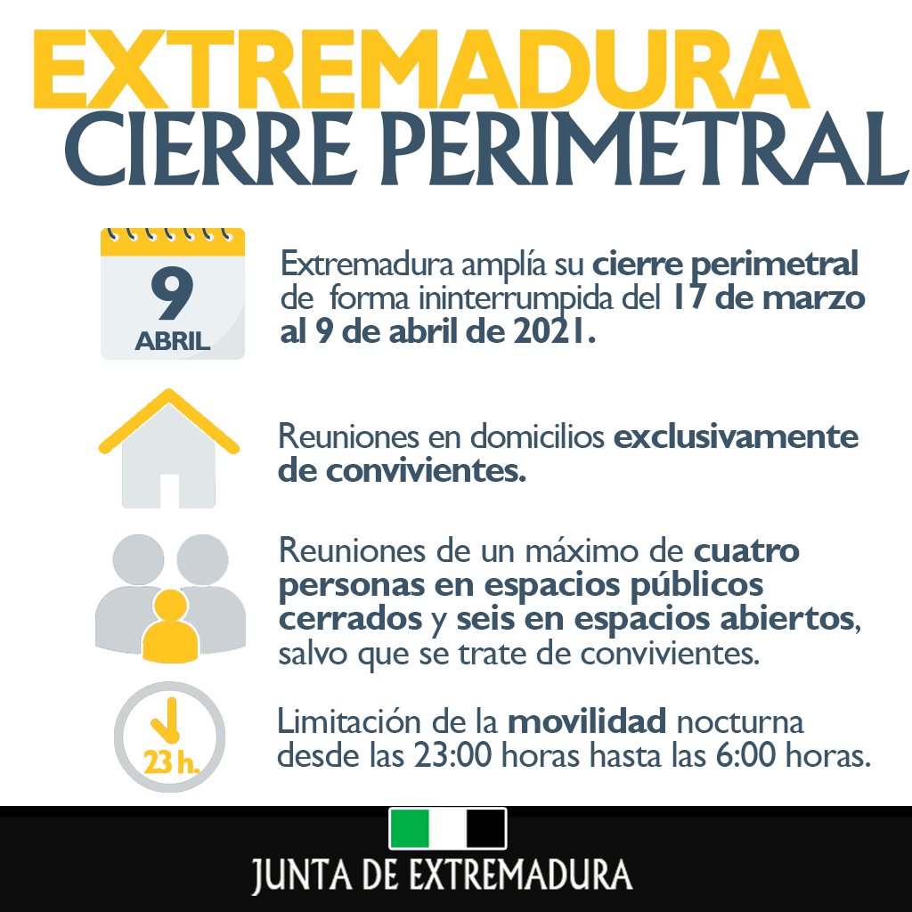 Extremadura mantiene el cierre perimetral y el de la hostelería, gimnasios y centros culturales solo en localidades de más de en las demás no hay cierre perimetral pero sí medidas de flexibilización. Consulte información sobre los diferentes colectivos vih sida, cáncer. Vergeles anuncia esta tarde los cambios en las medidas anticovid. El consejero de sanidad detalla en una rueda de prensa convocada a las 18.30 horas cómo quedarán reguladas las restricciones para. Zonas afectadas por restricciones nuevas medidas que se aplicarán desde las 00:00 horas del 5 de abril hasta las 00:00 horas del día.